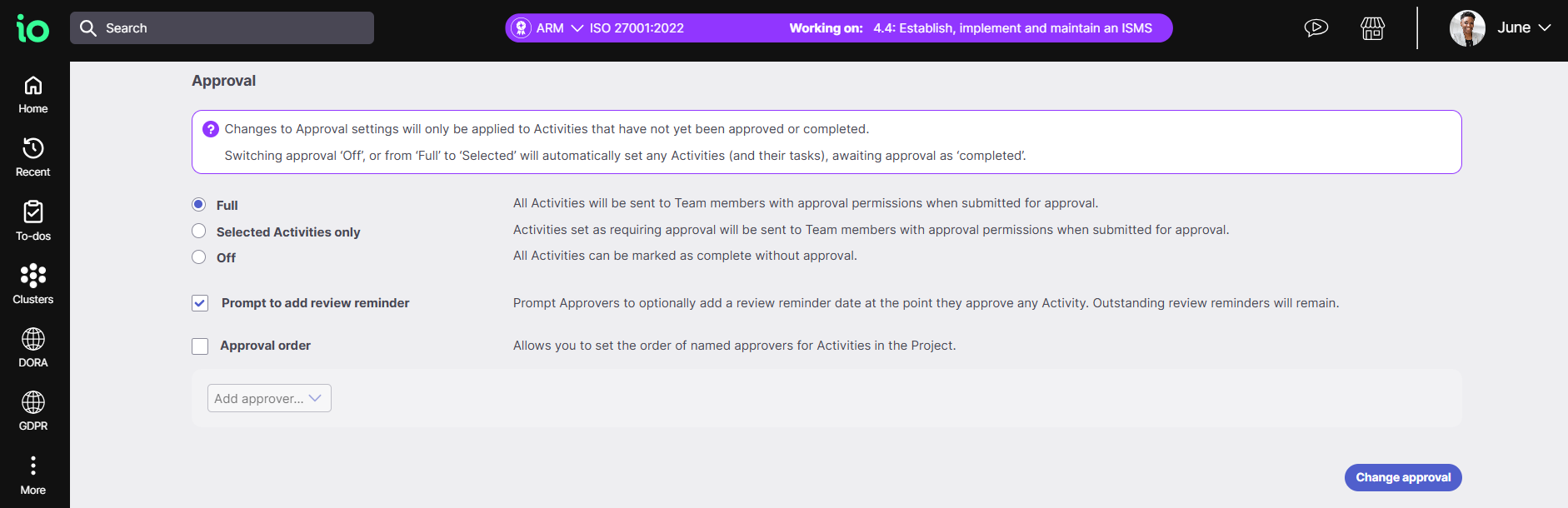 Select the option that fits your needs, then click Change approval to save your settings.
