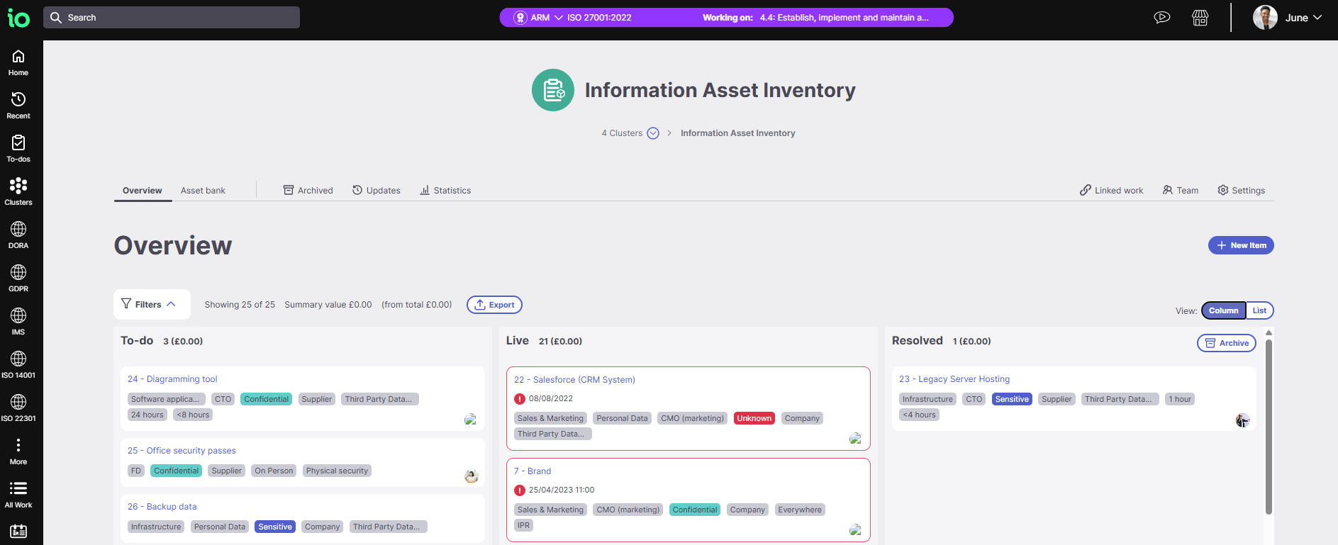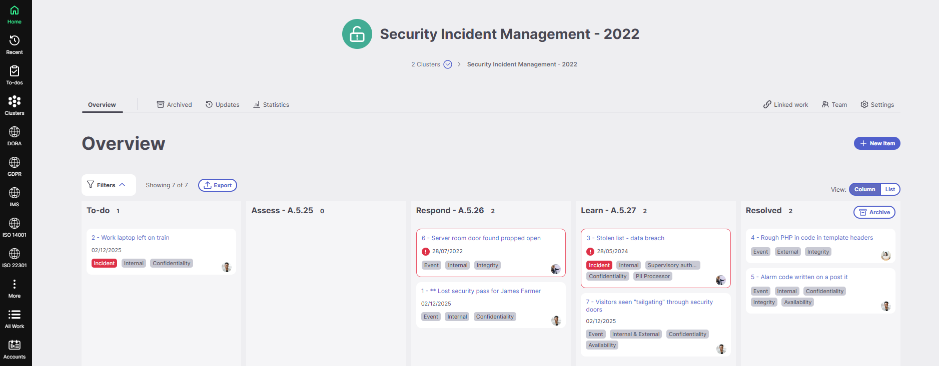 Tracks in ISMS.online are inspired by Kanban boards, giving you a clear, visual way to manage processes as they move through each stage. As items progress from left to right, each column reflects their status – for example, To-do, In progress, Pending review, and Resolved.