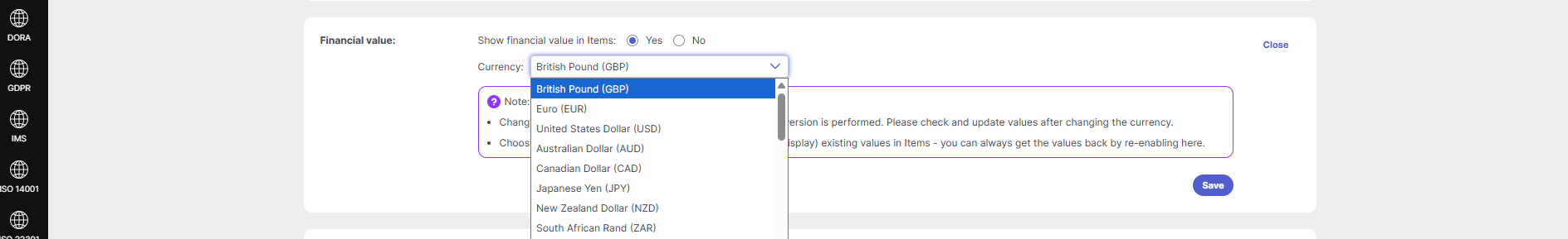 Note: Changing the currency symbol won’t convert entered values – it only updates the display symbol.
