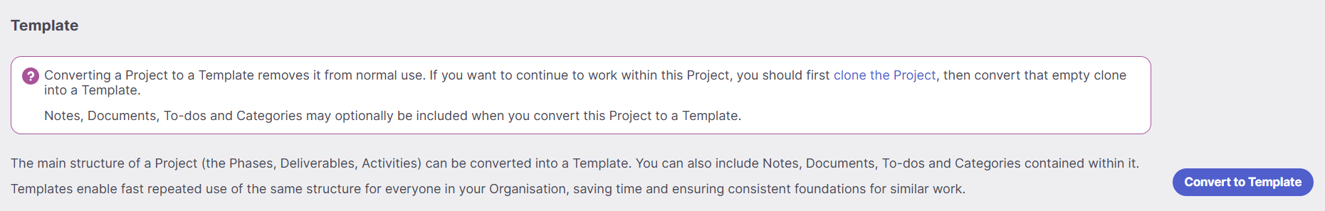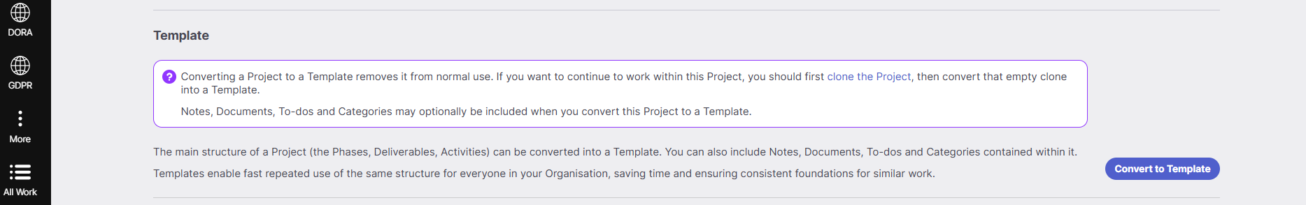 Project Templates enable repeatable work, such as business continuity plans or standard onboarding activities for new staff.