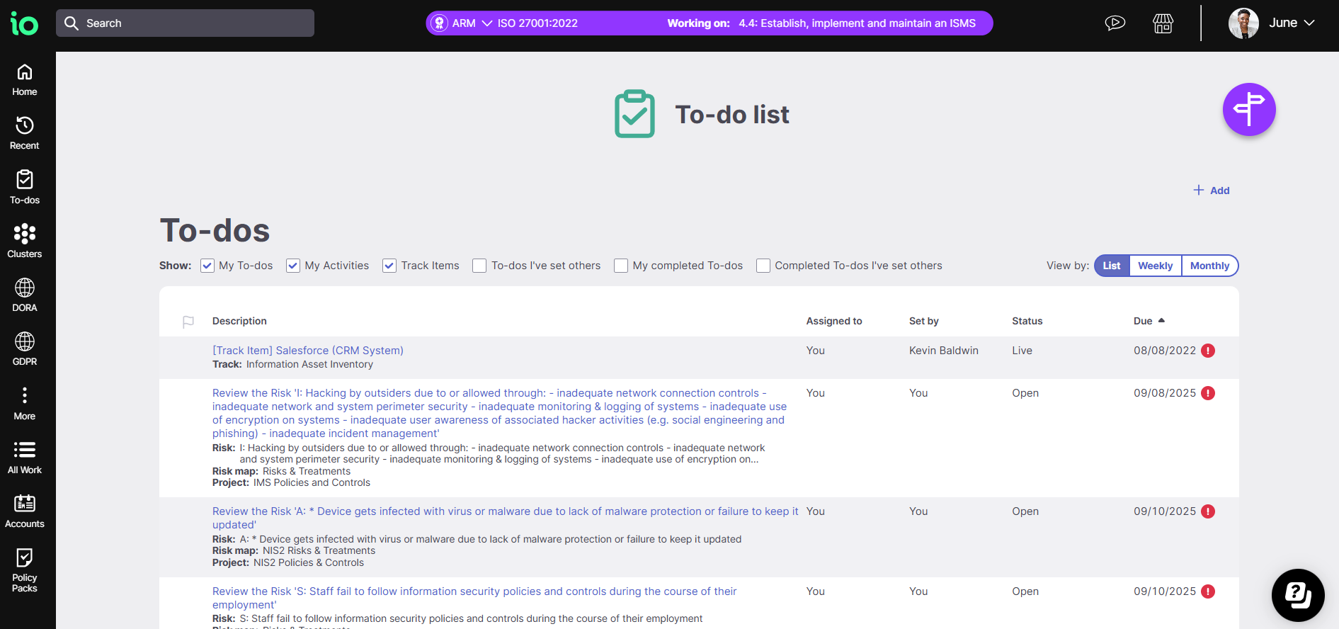 The To-do feature in ISMS.online helps you manage work efficiently by collecting all your tasks in one place. You can assign tasks to yourself or others, and colleagues can assign them to you. Alongside Activities from Projects, these appear in a clear, centralised To-do list, making it easy to stay on top of your priorities.
