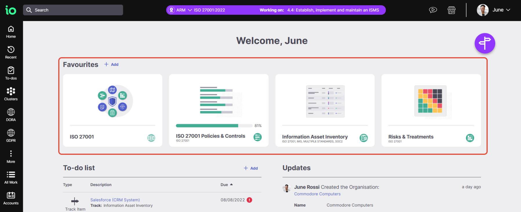 Most Work areas can be favourited directly from the ISMS.online homepage: