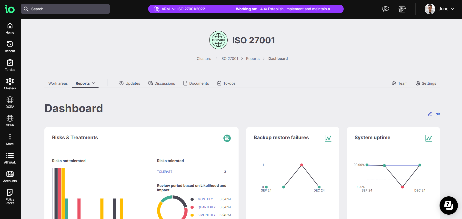 The Cluster Dashboard gives you a clear, real-time view of how your ISMS is performing. By bringing together the current status of your Tracks, Risk Registers, KPIs, and Policy Packs, it helps you see at a glance how you’re progressing towards your information security objectives. This overview not only supports day-to-day decision making but also makes it easy to prepare for management reviews by bringing the information you need into one place.