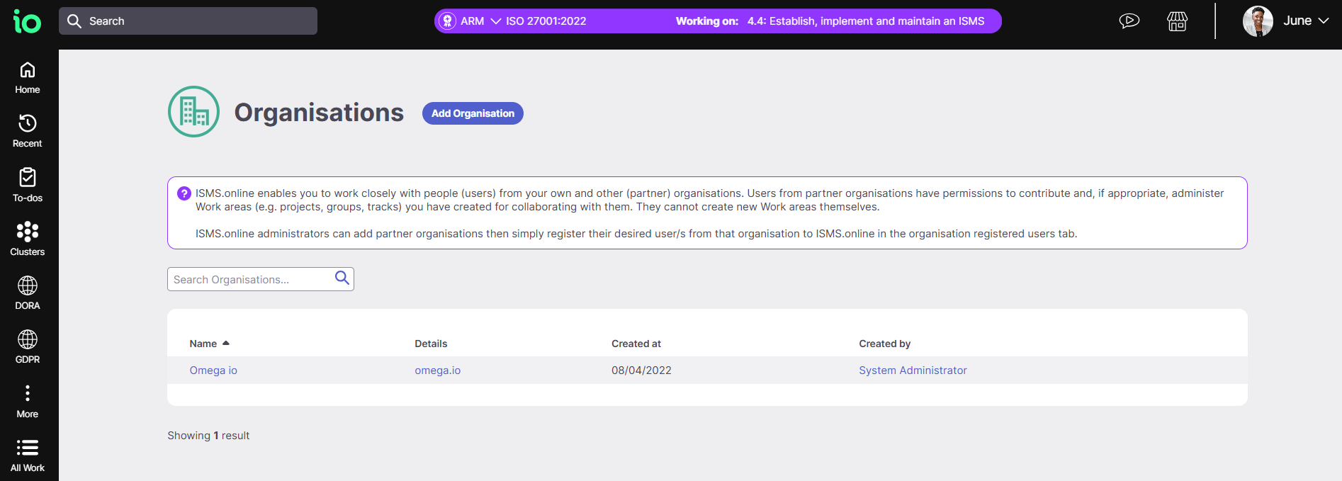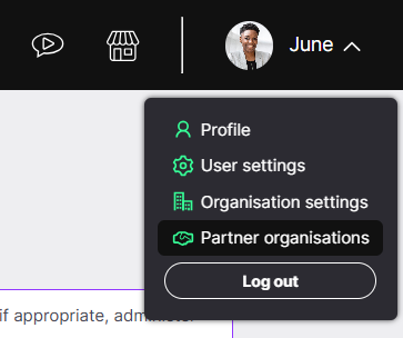 - Go to the Partner Organisations page, located in the top-right corner user dropdown.