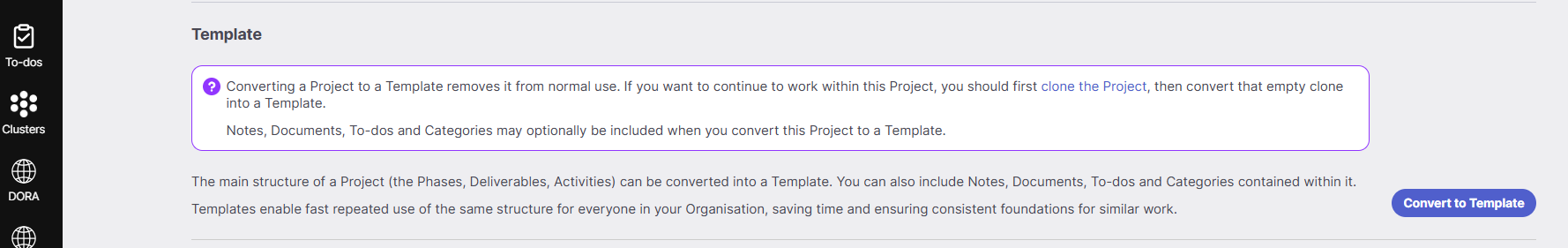 - Choose what to include – Select Notes, To-dos, and/or Documents if you’d like these to carry over into any new Projects created from the Template. This is particularly useful for including guidance notes or standard forms.