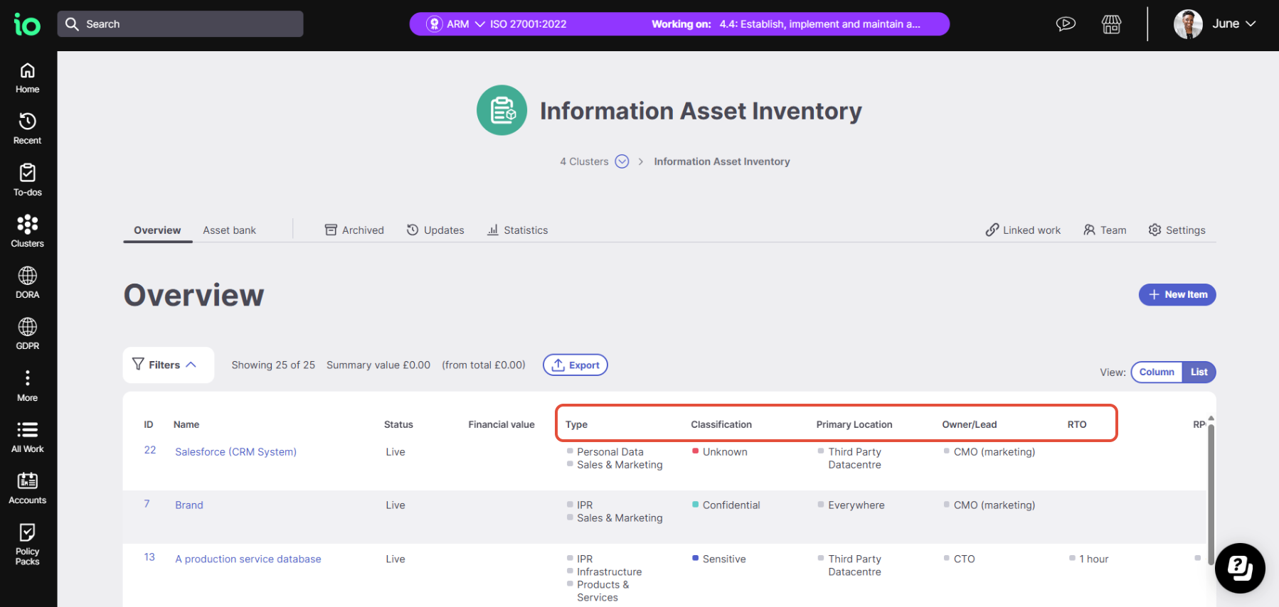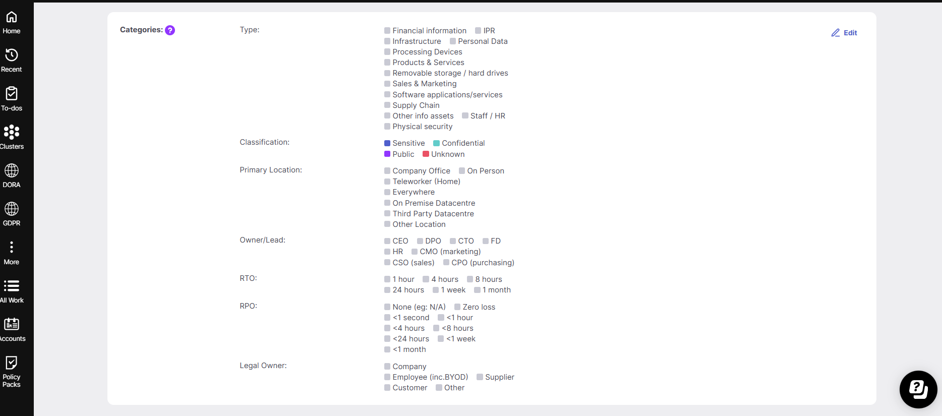 In the preconfigured Information Asset Inventory (ISO 27001), there’s a parent category called Type. Within it, you’ll find child categories that let you define whether an asset contains Financial Information, Personal Data, and so on.