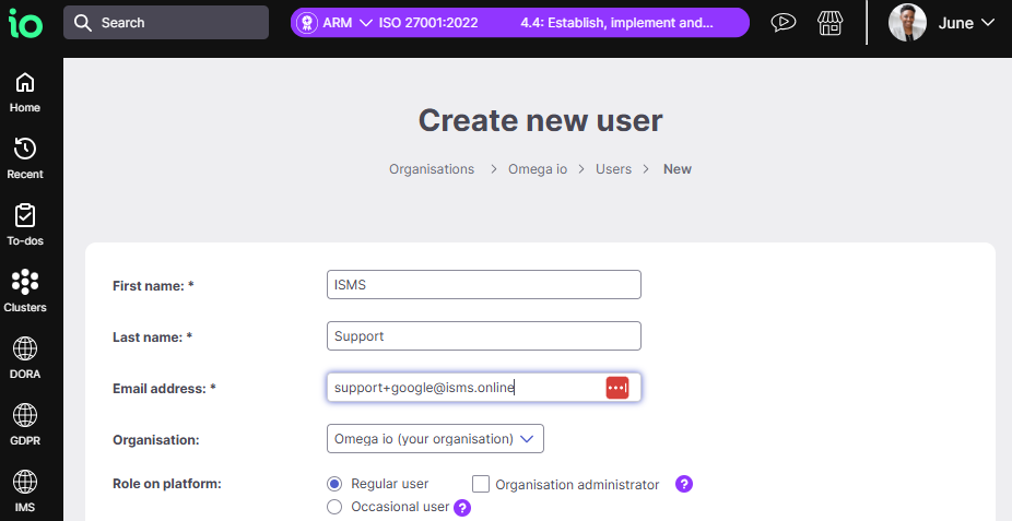 - Name the account ISMS Support or ISMS.online Support.